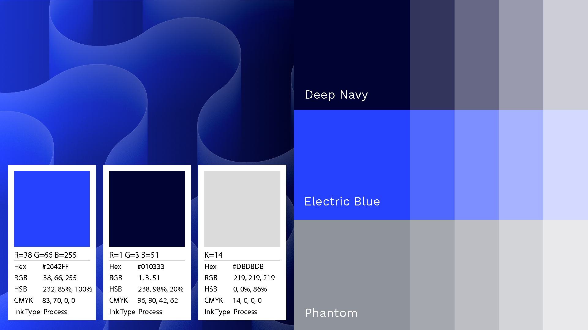 Every color is intentional. Electric Blue (#2642FF): high-energy and unmistakable. Deep Navy (#010333): strong, steady, reliable. Phantom Gray (#DBDBDB): clean, modern, and keeps the focus where it belongs. No fluff—just a brand built to last.